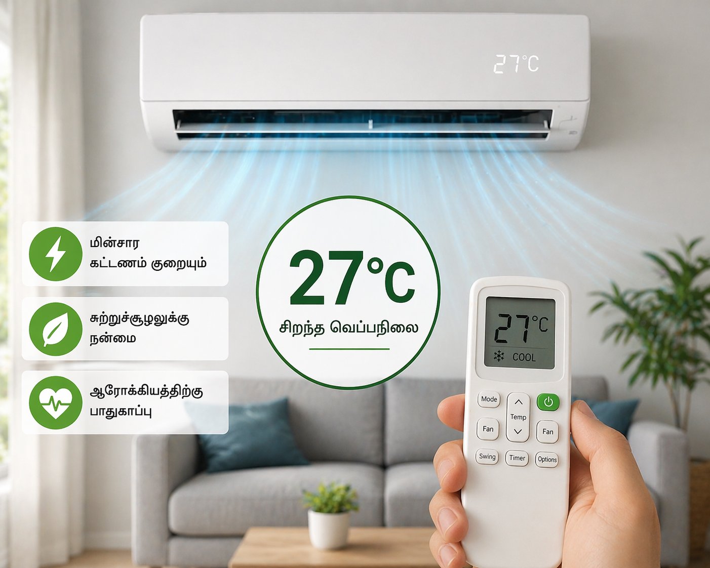 எனவே, மின்சார கட்டணத்தை குறைக்கவும், ஆரோக்கியத்தை பாதுகாக்கவும், சுற்றுச்சூழலுக்கு உதவவும், ஏசியை 27°C வெப்பநிலையில் பயன்படுத்துவது சிறந்த தேர்வாகும்.