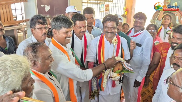 தமிழக தேர்தல் களம் உச்சக்கட்டத்தை எட்டியுள்ள நிலையில், செங்கல்பட்டு சட்டமன்றத் தொகுதியின் அதிமுக வேட்பாளர் கஜா (எ) கஜேந்திரன் இன்று தனது தேர்தல் களப்பணியில் விஸ்வரூபம் எடுத்தார். ஆலப்பாக்கம் ஊராட்சிக்கு உட்பட்ட இருங்குன்றப்பள்ளி, பீடிநகர், ஒழலூர், வேம்பாக்கம் உள்ளிட்ட பகுதிகளில் மேளதாளங்கள் முழங்க, பாஜக, பாமக, அமமுக மற்றும் புரட்சி பாரதம் உள்ளிட்ட கூட்டணி கட்சிகளின் நிர்வாகிகள் புடைசூழ அவர் தீவிர வாக்கு சேகரிப்பில் ஈடுபட்டார். வேட்பாளருக்குப் பெண்கள் ஆரத்தி எடுத்து உற்சாக வரவேற்பு அளித்தனர்.