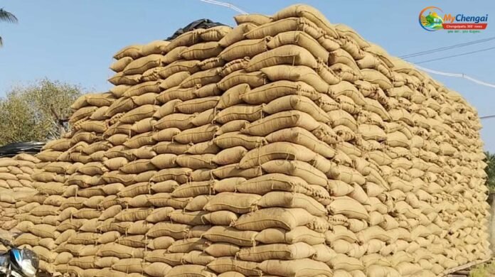 செங்கல்பட்டு அருகே விளைவித்த நெல்லை விற்பனை செய்ய முடியாமல், கொள்முதல் நிலையங்களிலேயே விவசாயிகள் இரவு பகலாகத் தவம் கிடக்கும் அவல நிலை ஏற்பட்டுள்ளது. வில்லியம்பாக்கம் மற்றும் சாஸ்தரம்பாக்கம் ஆகிய இடங்களில் உள்ள அரசு நெல் கொள்முதல் நிலையங்களில் லட்சக்கணக்கான நெல் மூட்டைகள் தேக்கமடைந்துள்ளதால் விவசாயிகள் பெரும் துயரத்திற்கு ஆளாகியுள்ளனர்.