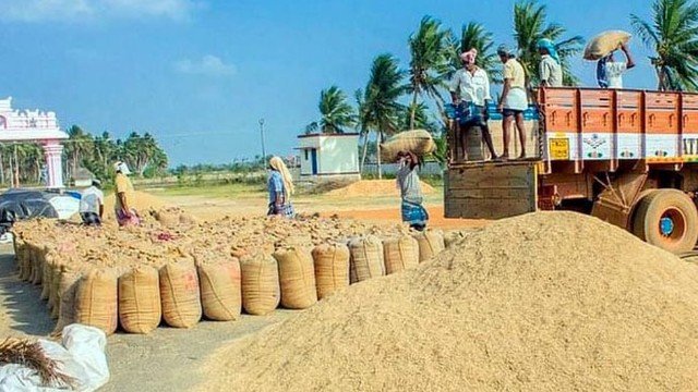 இந்த பகுதியில் 4,000 ஏக்கருக்கும் மேற்பட்ட பரப்பளவில் நெல் சாகுபடி நடைபெறுகிறது. ஆனால், கூலி தொழிலாளர்கள் தமிழ் புத்தாண்டு மற்றும் தேர்தல் காரணமாக சொந்த ஊர்களுக்கு சென்றதால், ஆட்கள் பற்றாக்குறை ஏற்பட்டுள்ளது. மேலும், நெல் மூட்டைகளை ஏற்றிச் செல்ல வேண்டிய லாரிகளும் முறையாக வராததால், குவிந்த நெல் வெளிப்புறத்தில் பாதுகாப்பின்றி கிடக்கிறது.