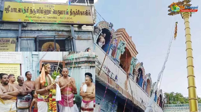 சிங்க பெருமாள் கோயில் அருகே நரசிம்ம பெருமாள் கோயிலில் வைகாசி மாத பிரமோற்சவ விழா கொடியேற்றத்துடன் தொடங்கியது.