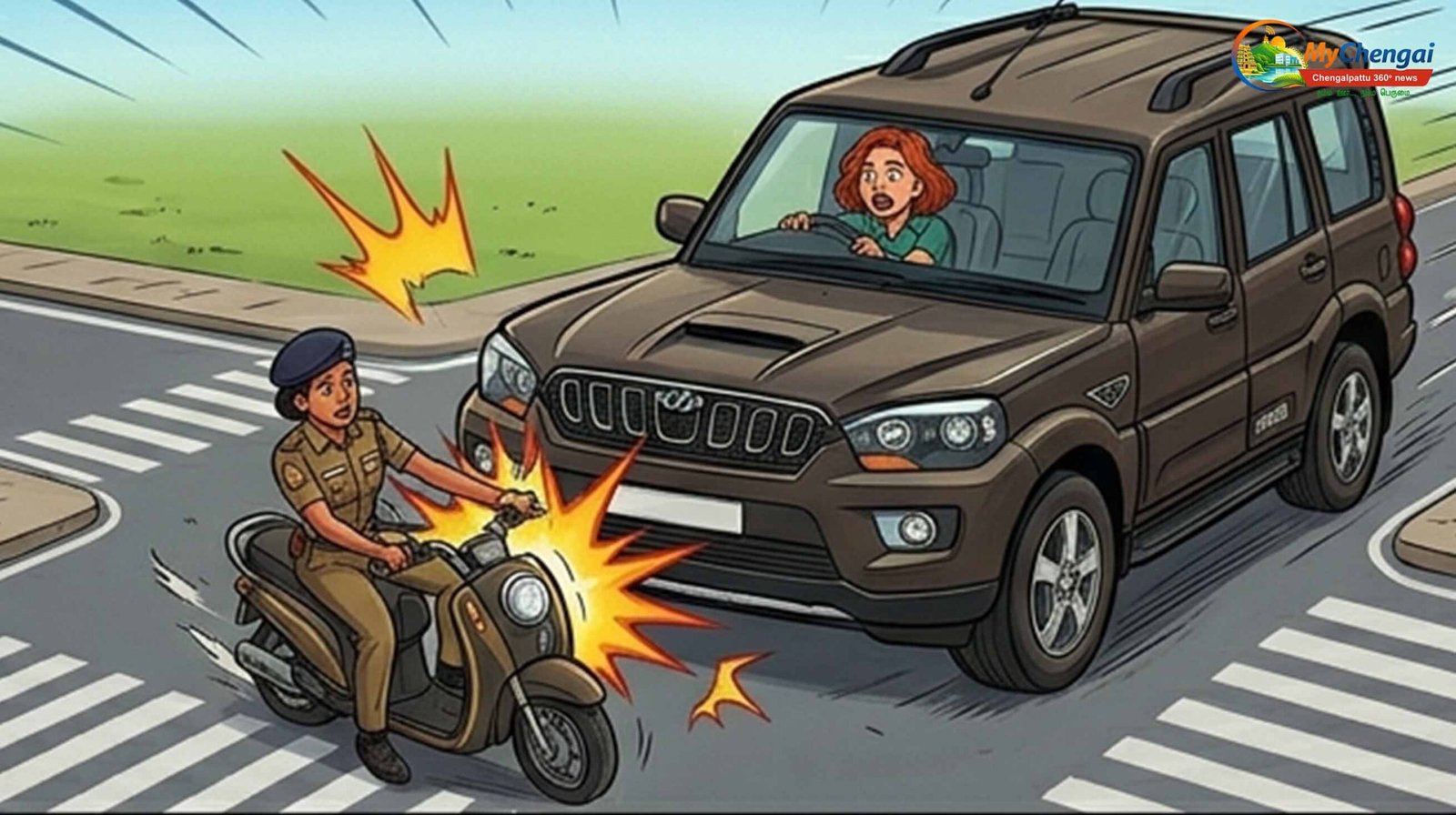 சென்னை சங்கர் நகர் காவல் நிலையத்தில் காவலராகப் பணிபுரிந்து வருபவர் சரண்யா. இவர் போழிச்சலூர் பகுதியில் வசித்து வருகிறார். இன்று காலை வழக்கம் போலத் தனது இருசக்கர வாகனத்தில் காவல் நிலையத்திற்குப் பணிக்குச் சென்று கொண்டிருந்தார். அப்போது குறுக்குச் சாலையிலிருந்து மின்னல் வேகத்தில் வந்த ‘ஸ்கார்பியோ’ (Scorpio) வாகனம், எதிர்பாராத விதமாகச் சரண்யாவின் வாகனத்தின் மீது மோதியது. இதில் தூக்கி வீசப்பட்ட சரண்யாவுக்குக் கையில் பலத்த எலும்பு முறிவு ஏற்பட்டு ரத்த வெள்ளத்தில் சரிந்தார். இதைக் கண்டு அதிர்ச்சியடைந்த பொதுமக்கள், அவரை உடனடியாக மீட்டு அருகிலுள்ள தனியார் மருத்துவமனையில் சிகிச்சைக்காகச் சேர்த்தனர்.